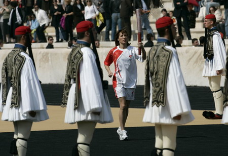 Greek athlete Pygi Devetzi carries the Olympic torch between two lines of presidential guards during the handover ceremony of the Beijing 2008 Olympic flame at Athen's Panathenian stadium, March 30, 2008. [Agencies]