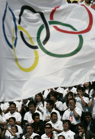 Chinese fans are seen behind an Olympic flag during the handover ceremony of the Beijing 2008 Olympics flame at the Panathenian stadium, site of the first modern Olympic games in 1896, in Athens March 30, 2008. [Agencies]