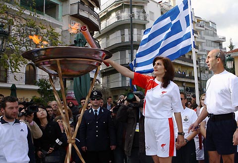 A torchbearer lights the Olympic flame from a cauldron in Kozani of Greece on March 26, 2008. The Olympic torch relay in Greece entered the third day on Wednesday. [Xinhua]