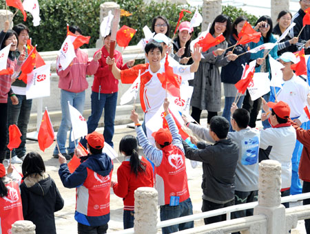China's 110m hurdles record-holder Liu Xiang waves his hand to celebrators as he carries the Olympic torch running through Tiananmen Square in Beijing March 31, 2008. President Hu Jintao officially announced the beginning of the Beijing Olympic torch relay on Monday. [Xinhua]