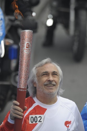 Torchbearer Mujdat Gezen holds the torch during the Olympic torch relay in Istanbul, Turkey, April 3, 2008. [Xinhua]