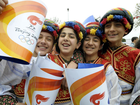 Local children in traditional costumes from Istanbul wait for the coming of the Olympic torch relay in Istanbul, Turkey, April 3, 2008. Istanbul is the second stopover of 2008 Beijing Olympic Games flame relay outside mainland of China. [Xinhua]