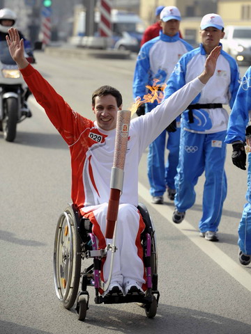 A wheelchair basketball player and torchbearer gestures on his wheelchair in St. Petersburg April 5, 2008. St. Petersburg is the third stopover of the 2008 Beijing Olympic Games flame relay outside the Chinese mainland. [Xinhua]