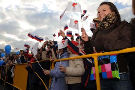 People cheer at the Victory Square, the start of the Olympic torch relay in St. Petersburg, Russia on April 5, 2008. St. Petersburg is the third stopover of the 2008 Beijing Olympic Games flame relay outside the Chinese mainland. [Xinhua]