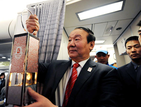 Jiang Xiaoyu (L), executive vice president of the Beijing Organizing Committee for the 2008 Olympic Games (BOCOG), walks out of the cabin holding up the lantern that encases the Olympic flame at the airport in London, April 6, 2008. The Beijing Olympic torch, after the two-day Russian relay in St. Petersburg, will on Sunday blaze its way through London - its fouth international stop - before setting off for Paris. [Xinhua]