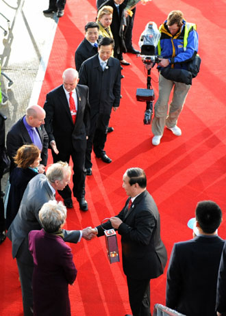 Jiang Xiaoyu (L), executive vice president of the Beijing Organizing Committee for the 2008 Olympic Games (BOCOG), shakes hands with British officials with the other hand holding up the lantern that encases the Olympic flame at the airport in London, April 6, 2008. The Beijing Olympic torch, after the two-day Russian relay in St. Petersburg, will on Sunday blaze its way through London - its fouth international stop - before setting off for Paris. [Xinhua]