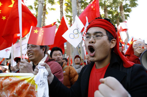 A local Chinese shouts before the beginning of the Olympic Torch relay in San Francisco, California April 9, 2008. [Agencies]