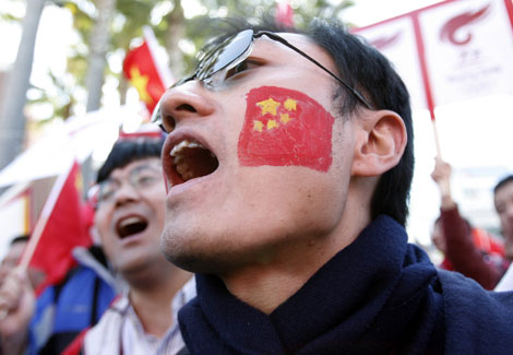 A man with the Chinese flag painted on his face shouts before the beginning of the Olympic Torch relay in San Francisco, California April 9, 2008. [Agencies]