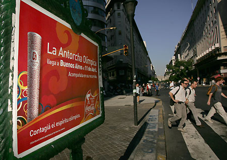 Pedestrians stroll by a billboard for the Olympic torch relay in Buenos Aires, capital of Argentina on April 11, 2008. The Beijing Olympic torch run in Buenos Aires is due to begin on Friday after the San Francisco relay ended smoothly on Thursday despite route changes made to ensure the dignity of the Olympic flame and the safety of torchbearers. [Xinhua]