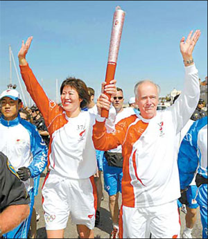 Lang Ping, coach of the US women's volleyball team, is accompanied by retired police officer James Dolan on the San Francisco leg of the torch relay yesterday. Xinhua