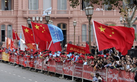Supporters of the Beijing Olympics gather outside the Casa Rosada Presidential Palace to wait for the the Olympic torch to pass by during the relay in Buenos Aires April 11, 2008. [Agencies]