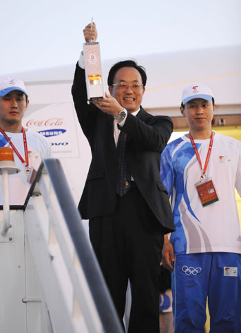Liu Jingmin, executive vice president of the Beijing Organizing Committee for the 2008 Olympic Games (BOCOG), carried the lantern of the flame and walked off the plane.