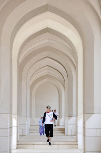 A visitor walks along the corridor of the Palace Muscat, April 14, 2008. The Beijing Olympic torch run in Muscat is due to begin on Monday. [Xinhua]