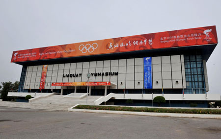 A poster for the Beijing Olympic torch relay hangs on a sports stadium in the Omani capital of Muscat, April 14, 2008. The Beijing Olympic torch run in Muscat is due to begin on Monday. [Xinhua]