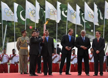 Pakistani President Pervez Musharraf (2nd L onstage) and Prime Minister Yousuf Raza Gillani (4th L onstage) hold the torch at the lighting ceremony of the Olympic torch relay at the Pakistan Sports Complex in Islamabad, capital of Pakistan, on April 16, 2008. [Xinhua]