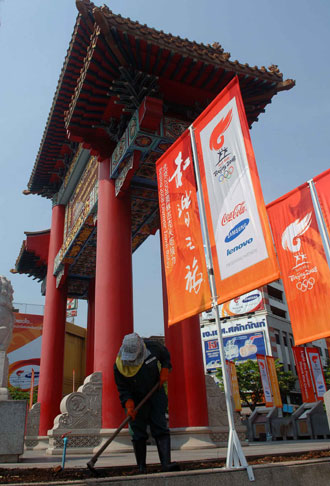 A worker makes preparations for the Beijing Olympic torch relay in front of the gate of the Chinatown district, Bangkok, April 17, 2008. The Olympic flame arrived in Bangkok Friday and will begin its 12th leg of the torch relay on Saturday. [Xinhua]