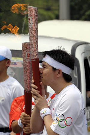 Cheah Soon Kit kisses the torch during the torch relay in Kuala Lumpur, Malaysia, April 21, 2008. Kuala Lumpur is the 13th stop of the 2008 Beijing Olympic Games torch relay. [Xinhua]