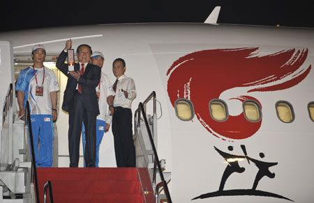 Jiang Xiaoyu, vice president of the Beijing Organizing Committee of Olympic Games, carries the lantern of the flame and walks off the plane at the Jakarta airport, Indonesian, April 22, 2008. The Jakarta leg of the Beijing torch relay is scheduled to run on Tuesday. [Xinhua]