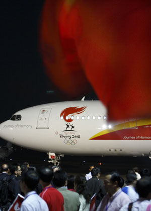 Local residents give warm welcome as the Olympic flame flies to Indonesian capital of Jakarta on early Tuesday. The Jakarta leg of the Beijing torch relay is scheduled to run on Tuesday. [Xinhua]