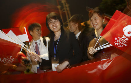 Overseas Chinese people give warm welcome as the Olympic flame arrives in Indonesian capital of Jakarta on early Tuesday. The Jakarta leg of the Beijing torch relay is scheduled to run on Tuesday. [Xinhua]