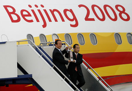 Jiang Xiaoyu (L), executive vice president of the Beijing Organising Committee for the Olympic Games, and Chinese Ambassador to Australia Zhang Junsai hold the Olympic flame upon its arrival at Fairburn air force base in Canberra April 23, 2008. The Canberra leg of the torch relay is scheduled to begin on Thursday. [Agencies] |