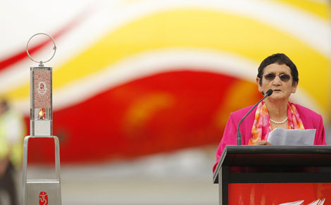 Australian Aboriginal elder Aunty Agnes welcomes the Olympic flame during a ceremony at Fairburn air force base in Canberra April 23, 2008. The Canberra leg of the torch relay is scheduled to begin on Thursday. [Agencies] |