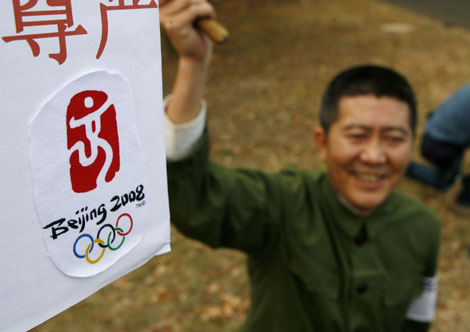 A supporter of the 2008 Beijing Olympic Games smiles upon the arrival of the Olympic flame at Fairburn air force base in Canberra April 23, 2008. The Canberra leg of the torch relay is scheduled to begin on Thursday. [Agencies] |