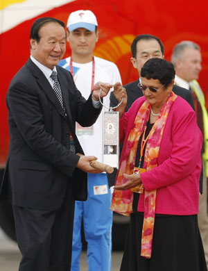 Jiang Xiaoyu (L), executive Vice President of the Beijing Organising Committee for the Olympic Games, holds the Olympic flame with Australian Aboriginal elder Aunty Agnes upon its arrival at Fairburn air force base in Canberra April 23, 2008. The Canberra leg of the torch relay is scheduled to begin on Thursday. [Agencies] |