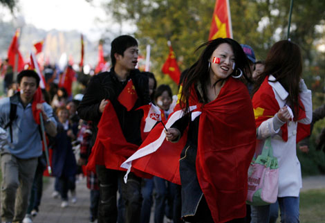 Overseas Chinese supporters wrap Chinese national flags around themselves during the Beijing Olympic torch relay in Canberra, Australia, April 24, 2008. The 15th leg of the global Olympic flame journey concluded at 11:30 local time Thursday as scheduled without major disruptions. [Agencies] |
