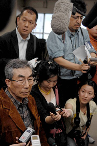A senior Japanese citizen (L), who is the eldest torch bearer of Beijing Olympic torch relay in Nagano, speaks in an interview Friday April 25, 2008. [Xinhua]