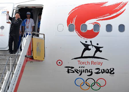 Yang Shu'an (front), Executive Vice President of the Beijing Olympic Organizing Committee, displays the lantern which holds the Olympic flame at the airport upon the arrival in Hong Kong, south China on April 30. The Olympic torch relay in Hong Kong will be held on May 2. [Xinhua]