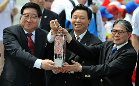 Yang Shu'an (C), Executive Vice President of the Beijing Olympic Organizing Committee, displays the lantern, which holds the Olympic flame, together with Gao Siren (L), director of the Liaison Office of the Central People's Government in the Hong Kong Special Administrative Region (HKSAR), and Timothy Fok Tsun-ting, president of the Olympic Committee of Hong Kong, upon the arrival in Hong Kong, south China on April 30. The Olympic torch relay in Hong Kong will be held on May 2. [Xinhua]