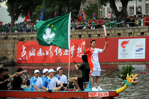 Pang Tsz Shan, a dragon boat racer, holds the Olympic torch on a dragon boat traveling on the Sai Van Lake in Macao May 3, 2008. The Macao leg of the Olympic Torch Relay kicked off on Saturday afternoon. [Xinhua]