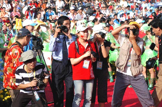 Hundreds of foreign and state media swarmed into tropical Hainan to greet the Olympic Torch arrival on May 6, 2008, and soak up the beauty of the Southern Chinese holiday resort. Hot air balloons, roller blading flag waving youngsters, naval ships, countless camera crews, army trucks with cheering locals and seemingly thousands of students lined the streets Tuesday morning at the crack of dawn to give a joyous welcome to the Olympic Torch arrival to Haikou city, capital of Hainan province, South China. [chinadaily.com.cn/Brendan John Worrell]