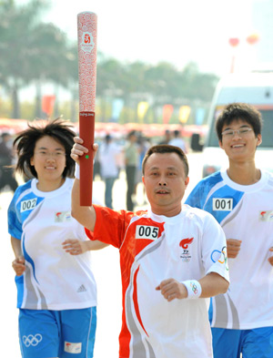 A torchbearer runs with the Beijing Olympic torch during its relay in Longyan, East China's Fujian Province, May 13, 2008.