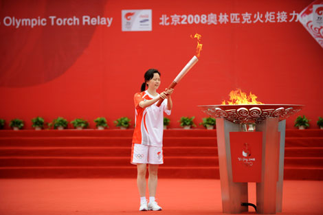 The Wushu world champion Fan Xueping lights the cauldron during the Beijing Olympic torch relay in Hefei, Anhui Province, May 28, 2008. [Xinhua] |