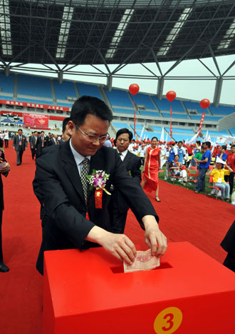 A man puts money into a donation box for Sichuan earthquake relief on the opening ceremonies of the Beijing Olympic torch relay in Hefei, Anhui Province, May 28, 2008. [Xinhua] |