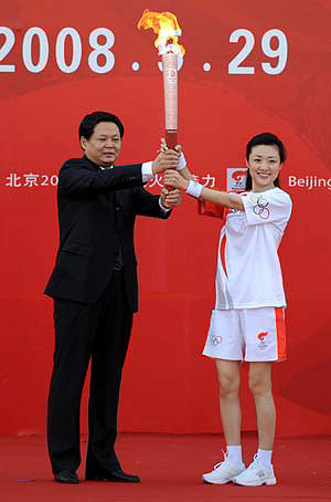 The first torchbearer, CCTV hostess, Zhou Tao receives the Olympic torch on the launching ceremon during Beijing Olympic torch relay in Huainan, east China's Anhui Province on May 29, 2008.