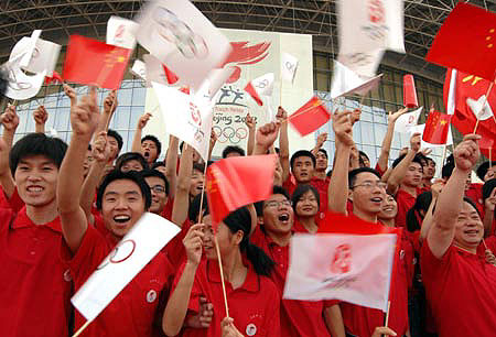 Local people celebrate the Beijing Olympic torch relay in Huainan. The Olympic torch relay of Huainan leg kicks off on Thursday May 29, 2008 in Huainan, east China's Anhui Province.