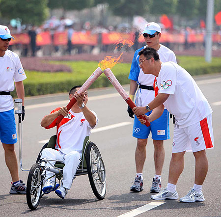 Torchbearer Xu Zhiping (L) lights up the torch for Liu Chunhua during the torch relay in Yueyang, central China's Hunan Province, June 3, 2008.