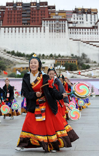 Local dancers perform a Tibetan ethnic dance to welcome the Olympic flame in front of the Potala Palace during the Beijing Olympic torch relay in Lhasa, capital of Southwest China's Tibet Autonomous Region, on June 21, 2008. [BOCOG]