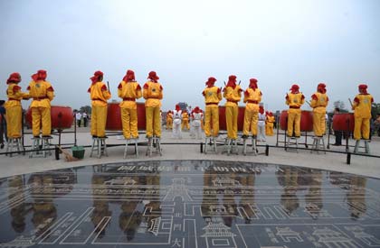 Folk dancers rehearse at Pingyao ancient city, in North China's Shanxi Province, June 22, 2008. The Olympic torch relay for the upcoming Beijing Games will be run in Pingyao on June 25, 2008. Pingyao ancient city is listed as a "World Cultural Heritage" by UNESCO and is one of the best-preserved examples of a walled city in China. The Olympic torch relay for the upcoming Beijing Games will be run in Pingyao on June 25, 2008. [Xinhua]