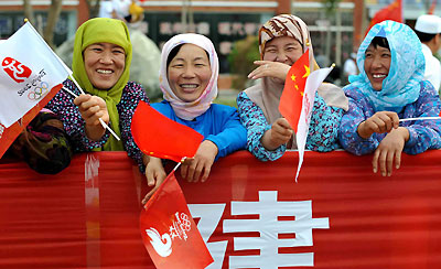 Local residents welcome the Olympic torch during its relay in Wuzhong, Ningxia Hui Autonomous Region, June 30, 2008. [Xinhua]