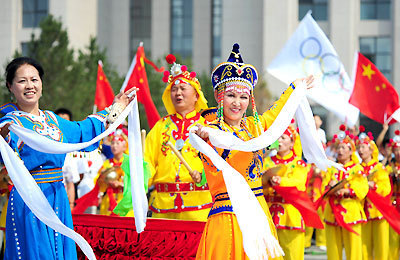 HOHHOT: Torchbearers and spectators tried various means to showcase their ethnic Mongolian culture , when the Olympic torch passed through the capital of the Inner Mongolia autonomous region on July 8, 2008.
