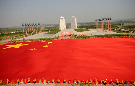 Local residents display a giant Chinese national flag, 80 meters in length and 55 meters in width, in the Genghis Khan Tourist Site during the Olympic torch relay in Erdos, Inner Mongolia Autonomous Region of China, July 9, 2008. [Xinhua]