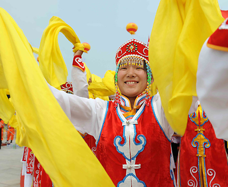 A local artist performs a Mongolian ethnic dance during the Beijing Olympic torch relay in Chifeng, Inner Mongolia Autonomous Region of China, July 10, 2008. [Xinhua]