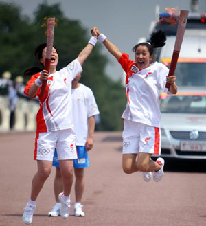 Chinese singer Sun Yue (R) jumps with joy with torchbearer Liu Haiying during the Beijing Olympic Torch Relay inHarbin,HeilongjiangProvince, July 11, 2008. [Xinhua]