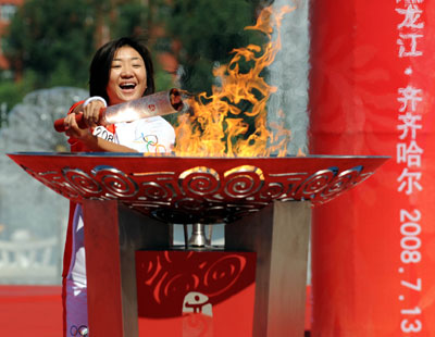 Speed skater Fu Tianyu, who was born in Qiqihar, lights the cauldron as the last torchbearer during the Beijing Olympic torch relay in her hometown of Heilongjiang Province, July 13, 2008. [Xinhua]