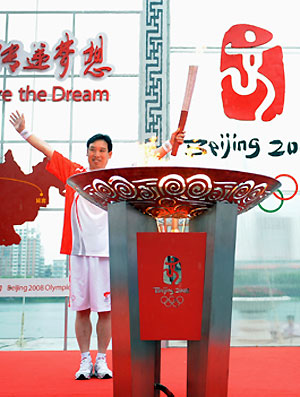 As the last torchbearer, businessman Wang Jinjun lights the cauldron and waves to the crowd. The Jilin leg of Olympic torch relay in Jilin Province kicked off July 15, 2008. [Xinhua]