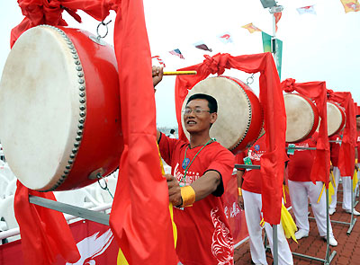 Drummers perform at the Olympic torch relay opening ceremony, marking the start of the Qingdao leg of the relay in Shandong Province on July 21, 2008. [Xinhua]